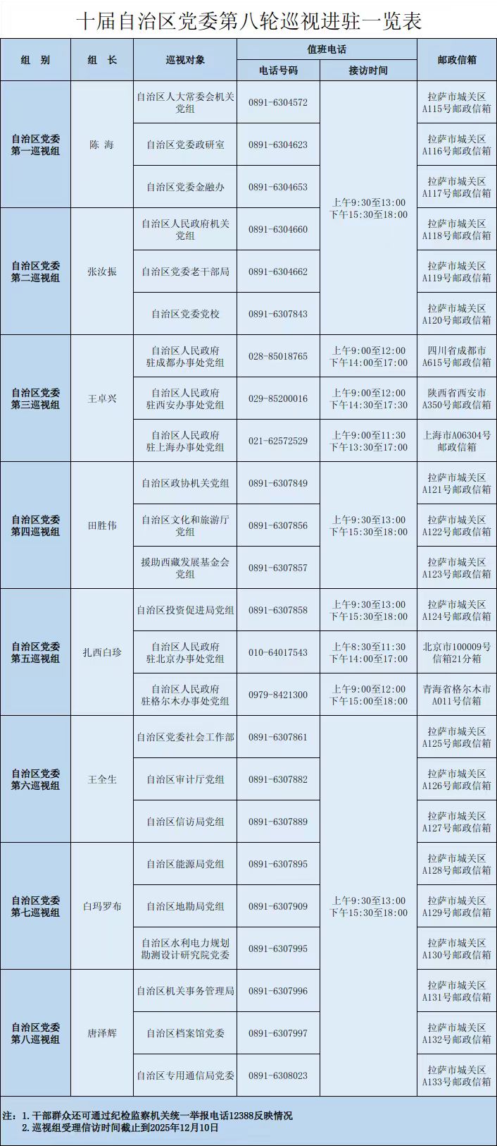 根据自治区党委关于巡视工作的统一部署,截至10月24日,十届自治区党委第八轮巡视完成进驻工作。自治区党委巡视组将对自治区人大常委会机关、政府机关、政协机关,自治区党委社会工作部、政研室、金融办、老干部局、机关事务管理局、党校,自治区审计厅、信访局、能源局、投资促进局、地勘局、档案馆、专用通信局、水利电力规划勘测设计研究院,自治区人民政府驻北京办事处、驻成都办事处、驻西安办事处、驻上海办事处、驻格尔木办事处,援助西藏发展基金会等23个区直单位党组织开展常规巡视;对自治区文化和旅游厅党组开展巡视“回头看”。