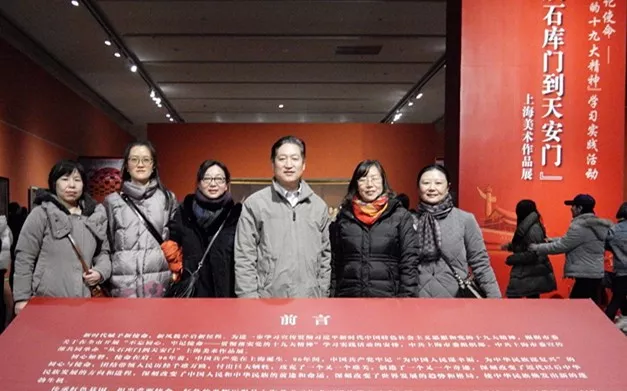 第二天俞允贵一行又参观了“从石库门到天安门”上海美术作品展。上海作为党的诞生地,城市的血脉中饱含着红色基因。作品展精心选取了凝聚上海美术家多年心血的96件作品,通过“石库门”“窑洞门”“天安门”“复兴门”等极具象征意义的“门”形象,生动记录了我们党96年风雨如磐、光辉灿烂的伟大历程,呈现了“进行伟大斗争、建设伟大工程、推进伟大事业、实现伟大梦想”的史诗景象。这既是一次高雅的艺术展出,更是一次深刻的党性教育和革命传统教育,通过艺术的形式,引导大家坚定理想信念,不负入党初心,坚持学思践悟、知行合一。